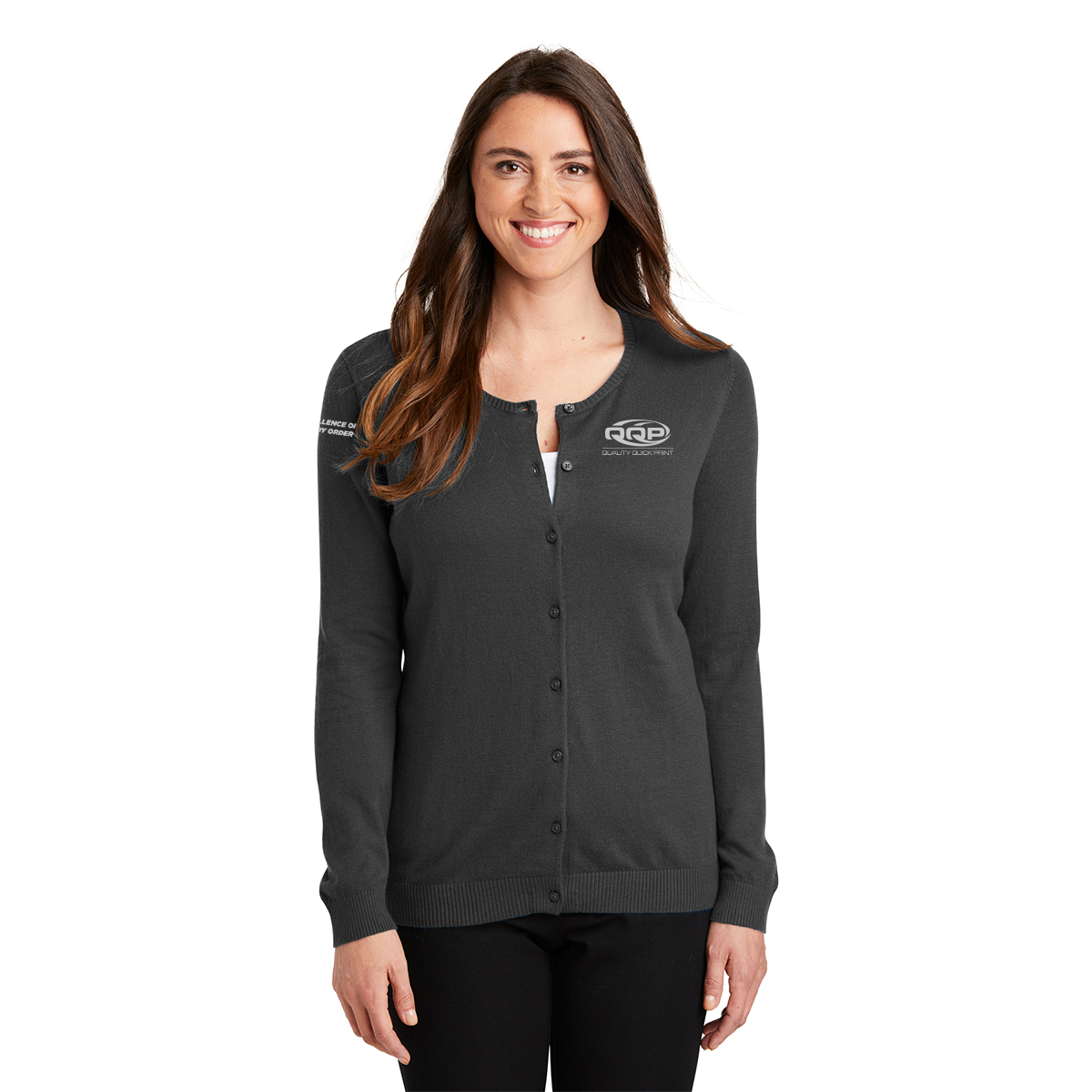 A working woman's dream: a button-front cardigan sweater that adds soft polish, yet washes and wears beautifully. This stylish cardigan easily layers over a polo or woven shirt and has fully-fashioned sleeves for long-lasting wear.
